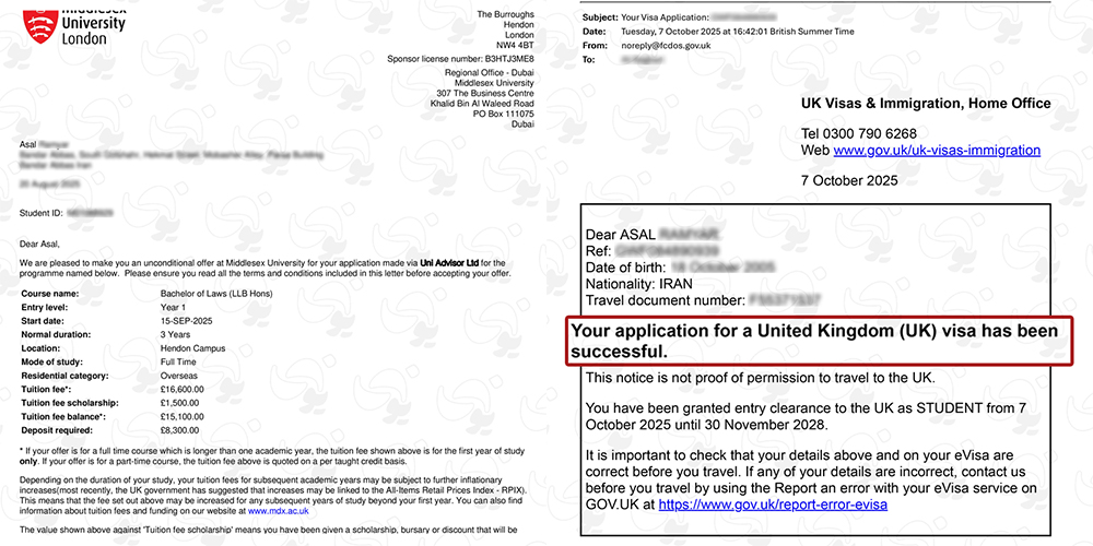 خانم عسل رامیار در آگوست ۲۰۲۵ پذیرش رشته حقوق از دانشگاه میدلسکس لندن را دریافت کردند و ویزای تحصیلیشان در اکتبر ۲۰۲۵ صادر شد. با همراهی مشاوران یونی ادوایزر، همه مراحل انتخاب رشته، آمادهسازی مدارک و ارسال پرونده به راحتی و بدون استرس انجام شد. رشته حقوق به دانشجویان مهارتهای تحلیلی و آشنایی با نظام حقوقی بریتانیا را آموزش میدهد و فارغالتحصیلان میتوانند در وکالت، مشاوره حقوقی و شرکتها فعالیت کنند.