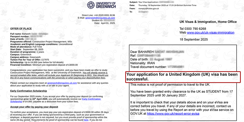 خانم بهاره سادات اخشیجان در آوریل ۲۰۲۵ پذیرش رشته مدیریت پروژههای ساختمانی از دانشگاه گرینیچ لندن را گرفتند و ویزای تحصیلیشان در اکتبر ۲۰۲۵ صادر شد. با راهنمایی مشاوران یونی ادوایزر، پروندهشان آماده و ارسال شد بدون دردسر. این رشته به دانشجویان کمک میکند مهارتهای برنامهریزی، زمانبندی و مدیریت منابع پروژههای ساختمانی را یاد بگیرند.