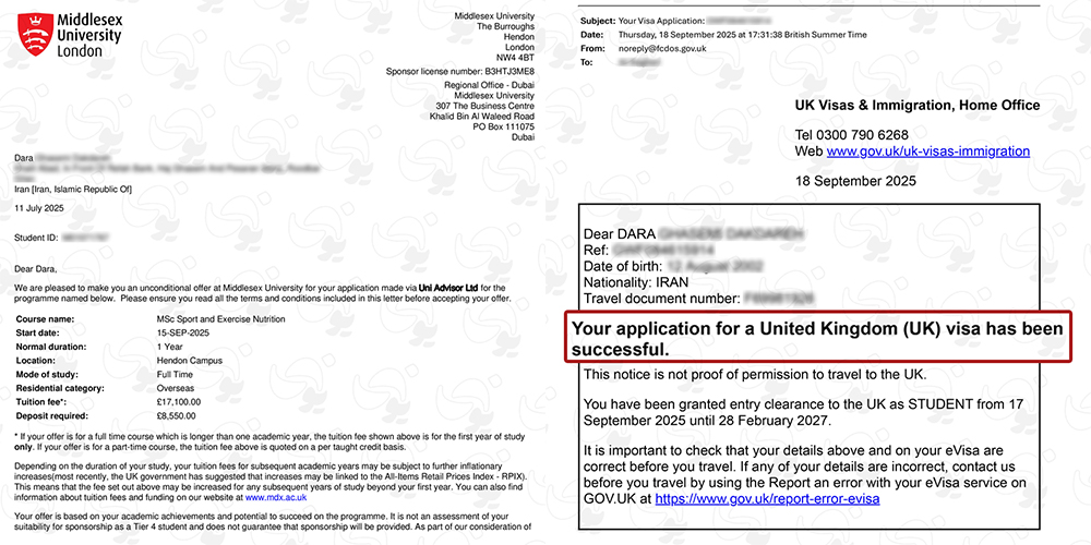آقای دارا قاسمی در جولای ۲۰۲۵ پذیرش رشته تغذیه ورزشی و تمرینات بدنی از دانشگاه میدلسکس لندن را دریافت کردند و ویزای تحصیلیشان در سپتامبر ۲۰۲۵ صادر شد. با کمک مشاوران یونی ادوایزر، همه مراحل پروندهشان با دقت و راحتی انجام شد. این رشته روی ارتباط تغذیه و عملکرد ورزشی تمرکز دارد و فارغالتحصیلان میتوانند در مشاوره تغذیه ورزشی، طراحی برنامه غذایی تخصصی و همکاری با تیمهای ورزشی حرفهای فعالیت کنند.
