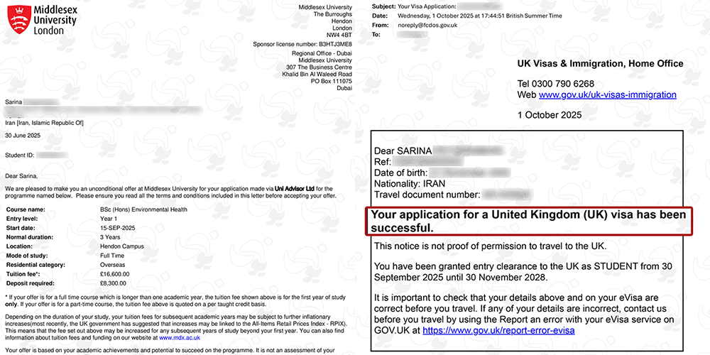 خانم سارینا پیغمبری در ژوئن ۲۰۲۵ پذیرش رشته بهداشت محیط زیست از دانشگاه میدلسکس لندن را دریافت کردند و ویزای تحصیلیشان در اکتبر ۲۰۲۵ صادر شد. مشاوران یونی ادوایزر در کنار ایشان بودند و پروندهشان بدون استرس آماده و ارسال شد. این رشته دانشجویان را با کنترل آلودگی، ایمنی محیط کار و مدیریت منابع طبیعی آشنا میکند و فارغالتحصیلان میتوانند در بهداشت عمومی، مشاوره محیط زیست و کنترل آلودگی فعالیت کنند.